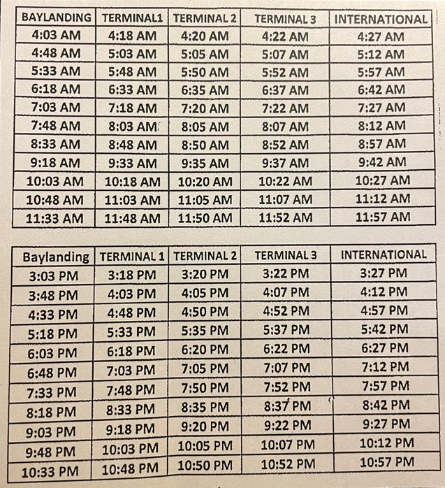 아래 시간표에서 "INTERNATIONAL" 이라 쓰여있는 곳이 공항에서 호텔로 출발하는 셔틀버스 시간이다.