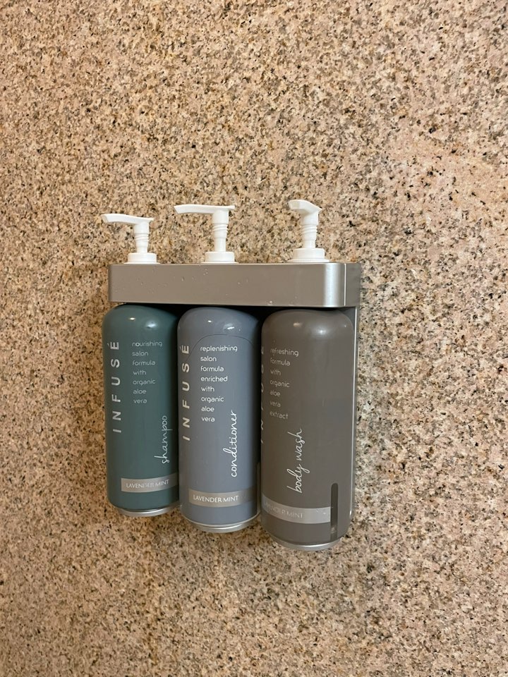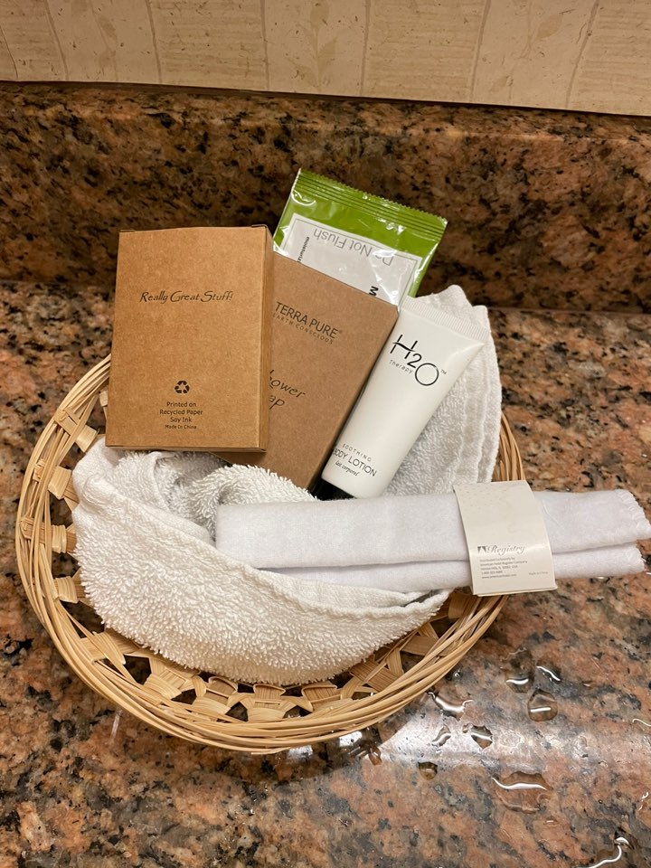 호텔 에머니티(Amenity)는 기본적인 것들만 구비되어 있다. 욕실에 바디워시, 샴푸, 컨디셔너가 샤워부스에 고정되어 있으며 타월은 3장씩 비치되어 있다. 헤어드라이기와 휴지, 샤워캡, 1회용 세안용품 등이 있고 1회용 칫솔, 치약, 면도기는 제공되지 않는다.