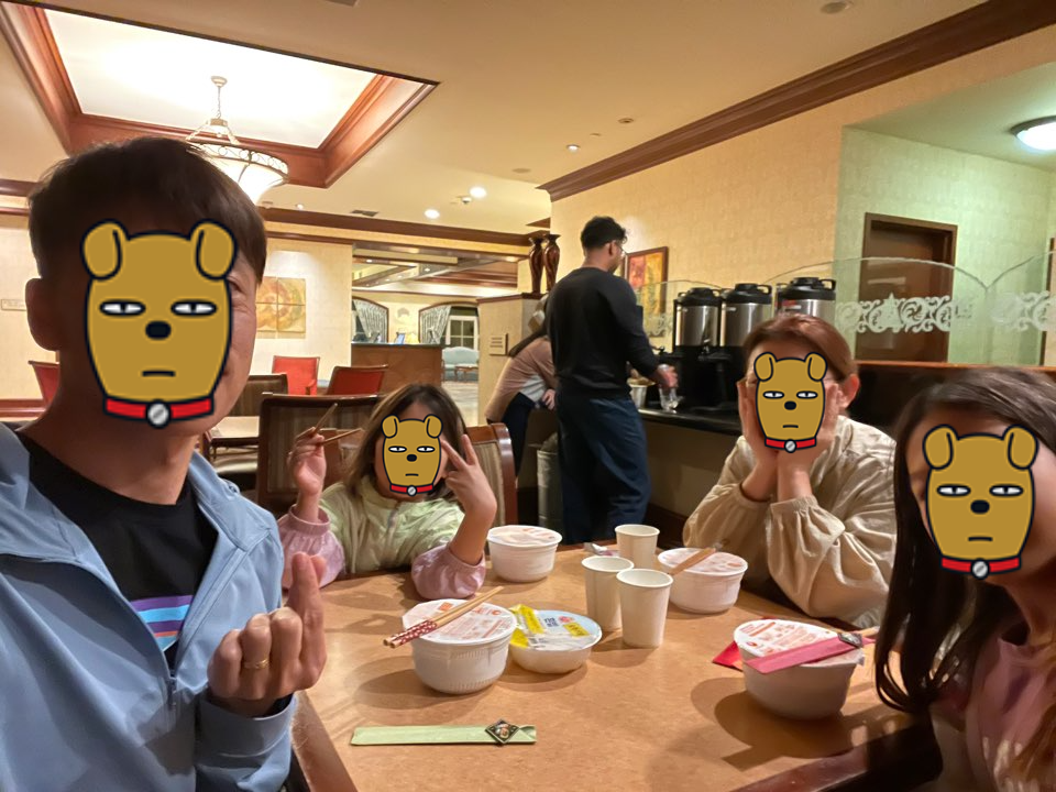 호텔 1층 로비에 여러 식당 테이블이 있는데 이곳에서 아침에 조식이 제공된다. 여기에 뜨거운 물과 커피, 차 티백이 항상 준비되어 있음으로 이곳에서 컵라면에 물을 받아먹으면 된다. 우리는 저녁 대신 컵라면을 먹었는데 우리 외에도 1명 더 라면을 즐기는 투숙객이 있었다.