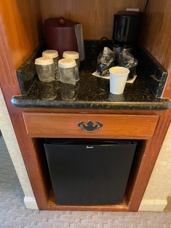 작은 냉장고, 전자레인지, 커피포트, 컵이 구비되어 있다. 커피포트는 드립커피를 내리는 용도이기 때문에 물 끓이는 용도로 사용할 수 없다.
